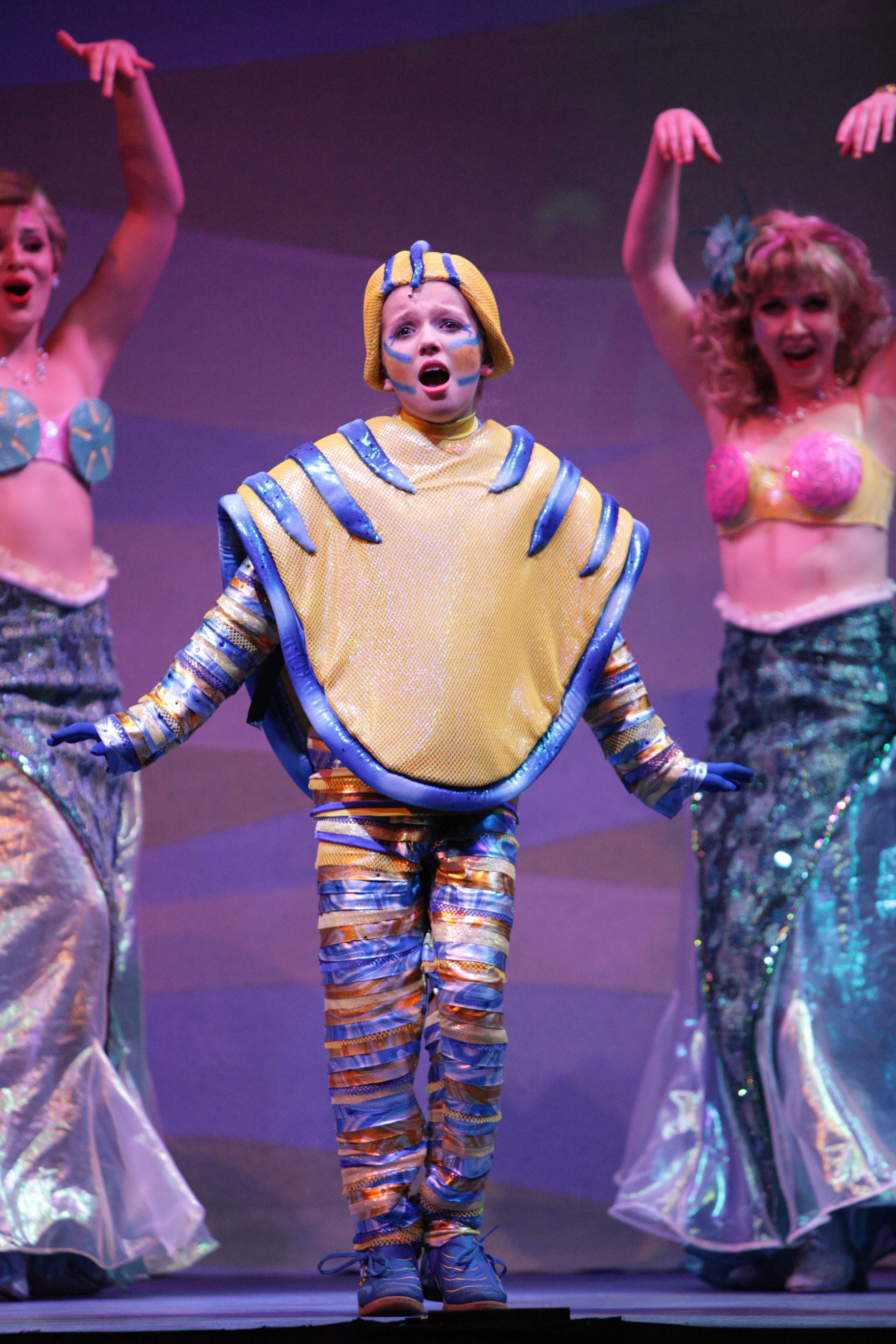 IN 2011, I WAS AN INTERN AT MUSIC THEATRE WICHITA IN THIER CRAFTS DEPARTMENT. MY RESPONSIBILITY DURING THE BUILD PROCESS OF DISNEY'S LITTLE MERMAID WAS TO BUILD HATS AND OTHER ACCESSORIES FOR MEMBERS IN THE ENSEMBLE, AS WELL AS SOME SPECIAL COSTUMING FOR FLOUNDER. THE COSTUMES WERE DESIGNED BY LEON DOBKOWSKI. PROFESSIONAL PHOTOGRAPHS TAKEN BY PAUL CHAUNCEY